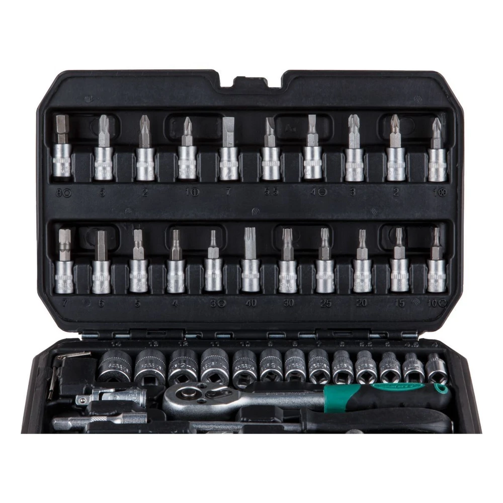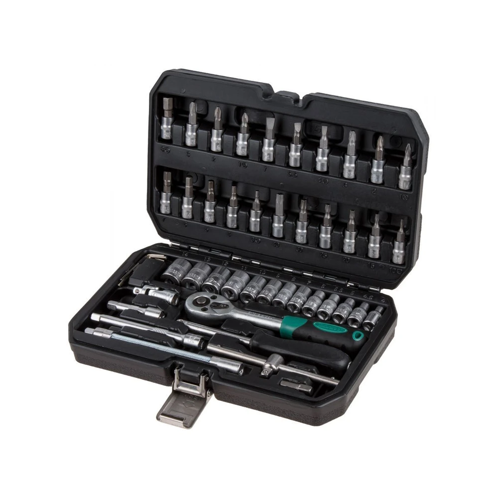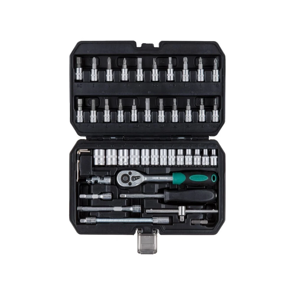 Ваш надежный помощник в гараже — набор головок и бит ВОЛАТ из 46 предметов для профессионального ремонта и обслуживания автомобилей! Этот многофункциональный комплект подойдет как для опытных механиков, так и для автолюбителей: от быстрого ремонта до сложных задач под капотом. Головки и насадки из высококачественной инструментальной стали с шестигранным профилем и сатинированной обработкой гарантируют долговечность, надежный захват и защиту от коррозии. Трещоточный механизм с 45 зубьями обеспечивает плавную работу даже в тесных пространствах. Всё уложено в прочный пластиковый кейс с металлическими замками — компактно, удобно и готово к транспортировке.