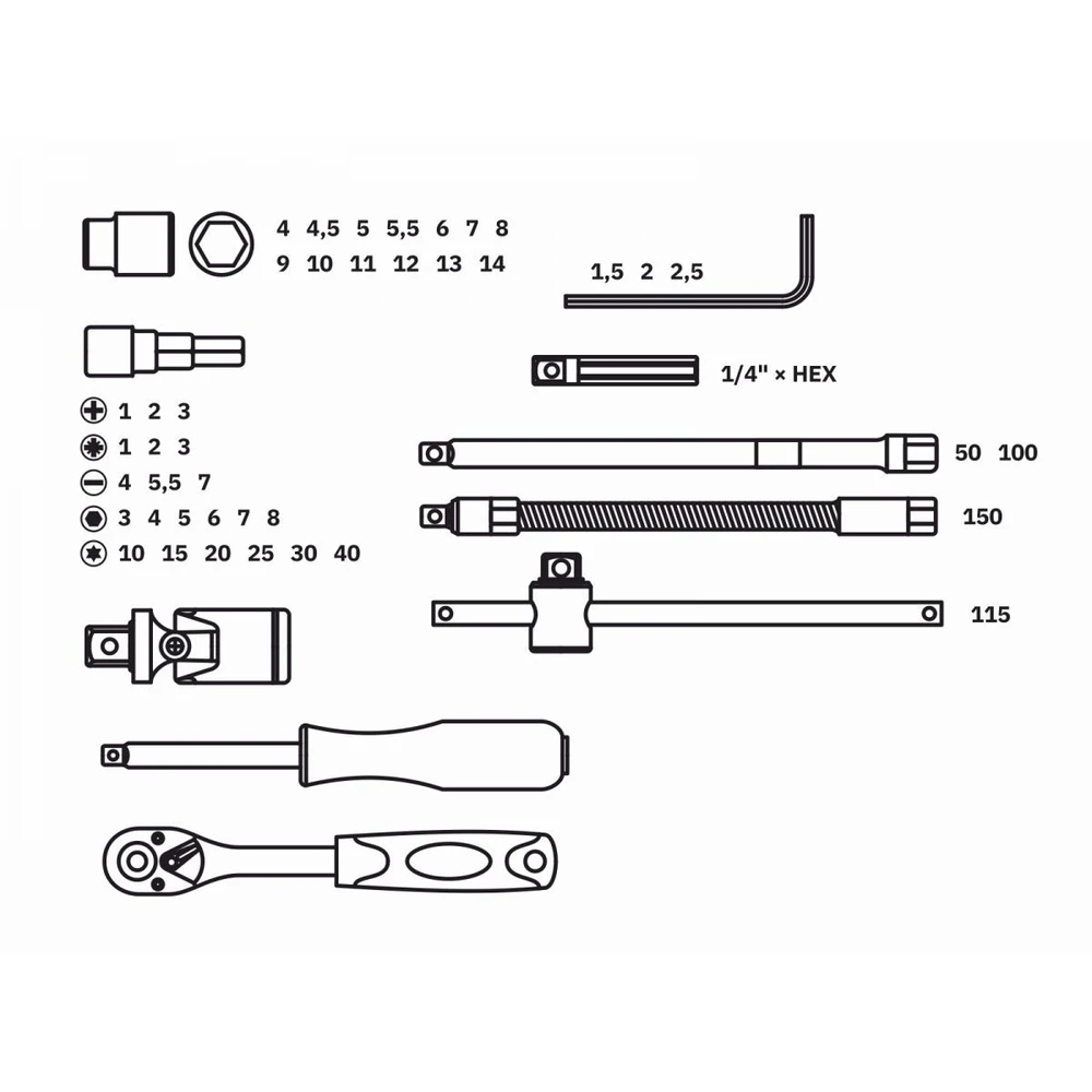 - Головка торцевая 1/4": 4, 4.5, 5, 5.5, 6, 7, 8, 9, 10, 11, 12, 13, 14 мм