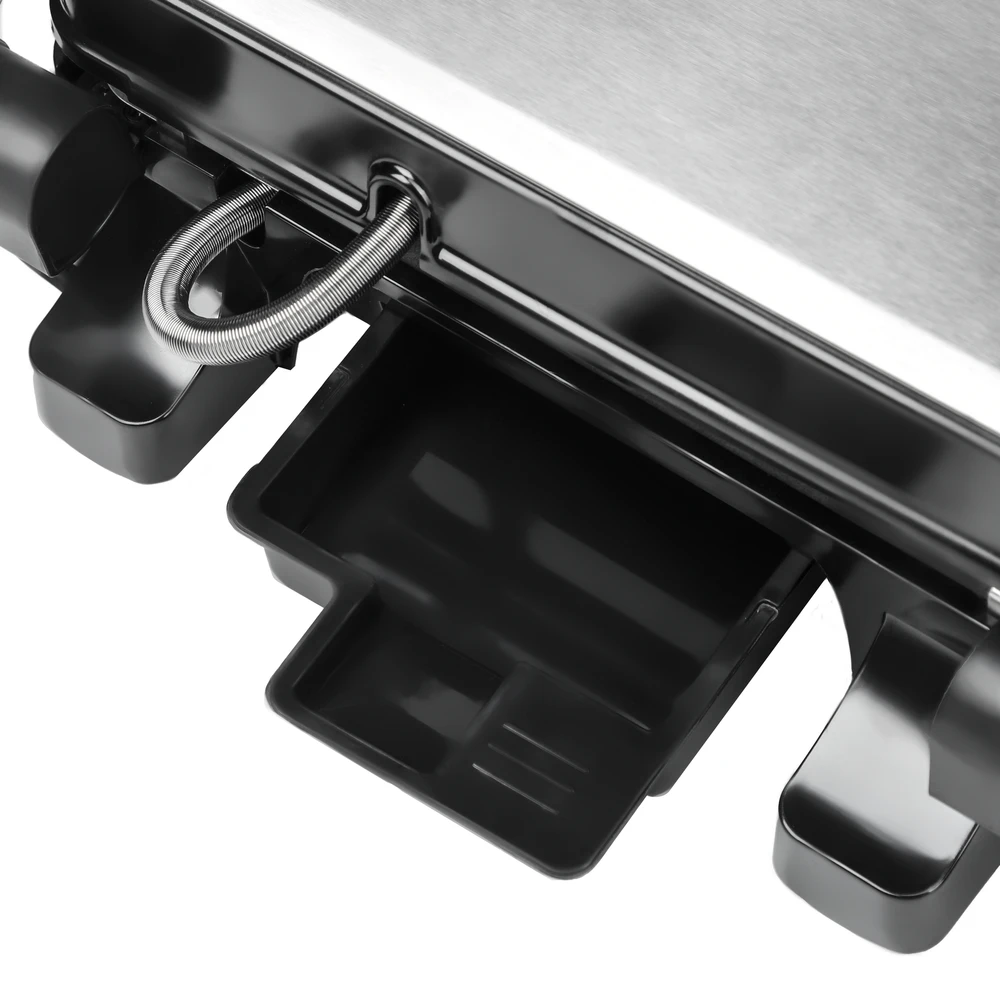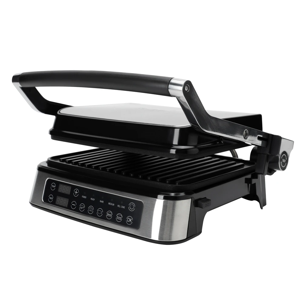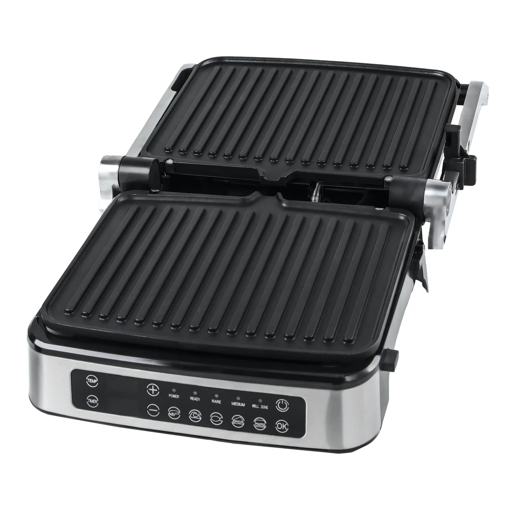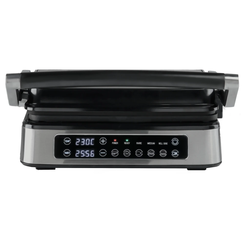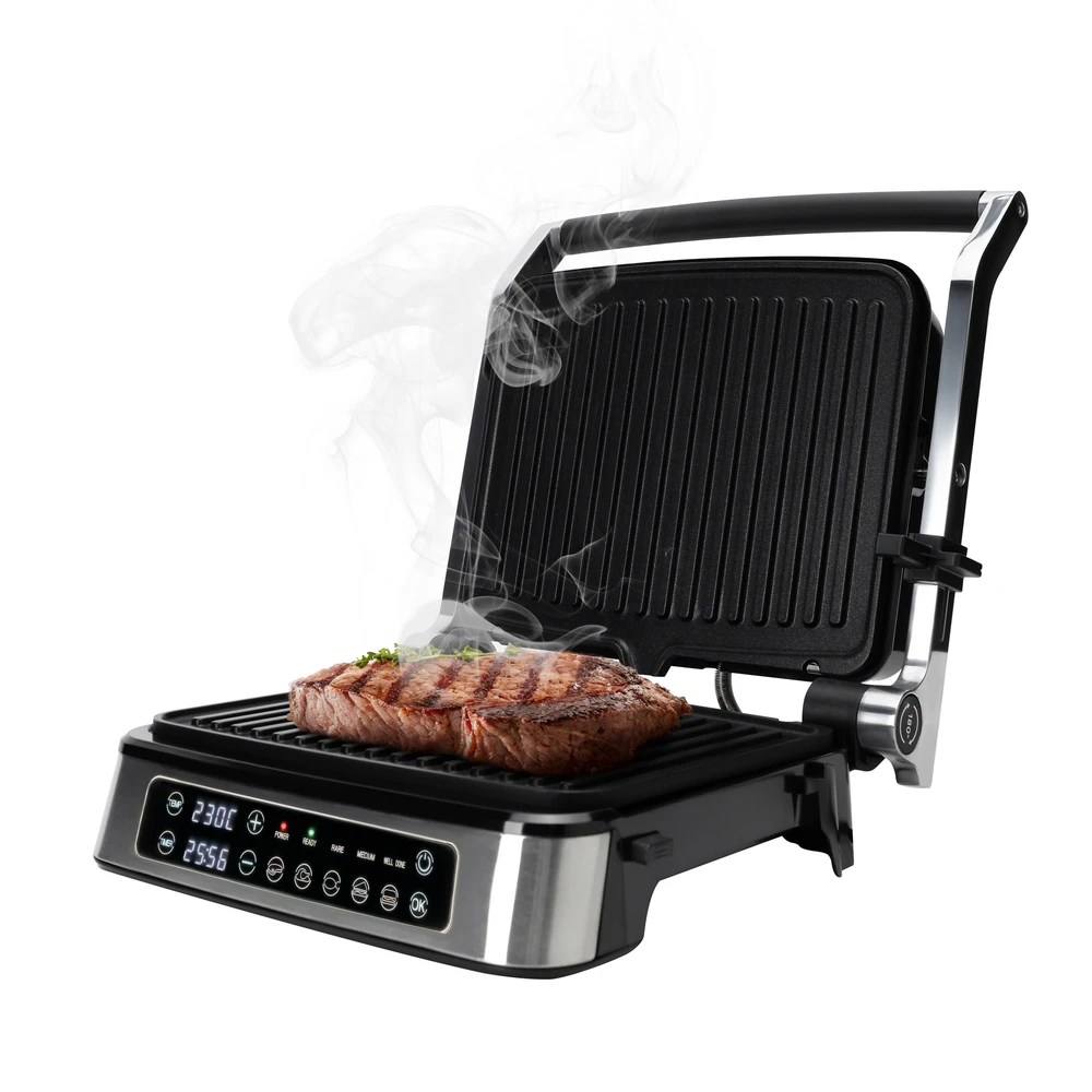 Профессиональный электрогриль с электронным управлением и мощностью 2000 Вт – готовьте сочные стейки, бургеры и сэндвичи без дыма и шума! Работает от сети 220-240 В, длина кабеля 75 см. Корпус из бакелита и нержавеющей стали с алюминиевой рабочей поверхностью, цвет – стильный серебристый.