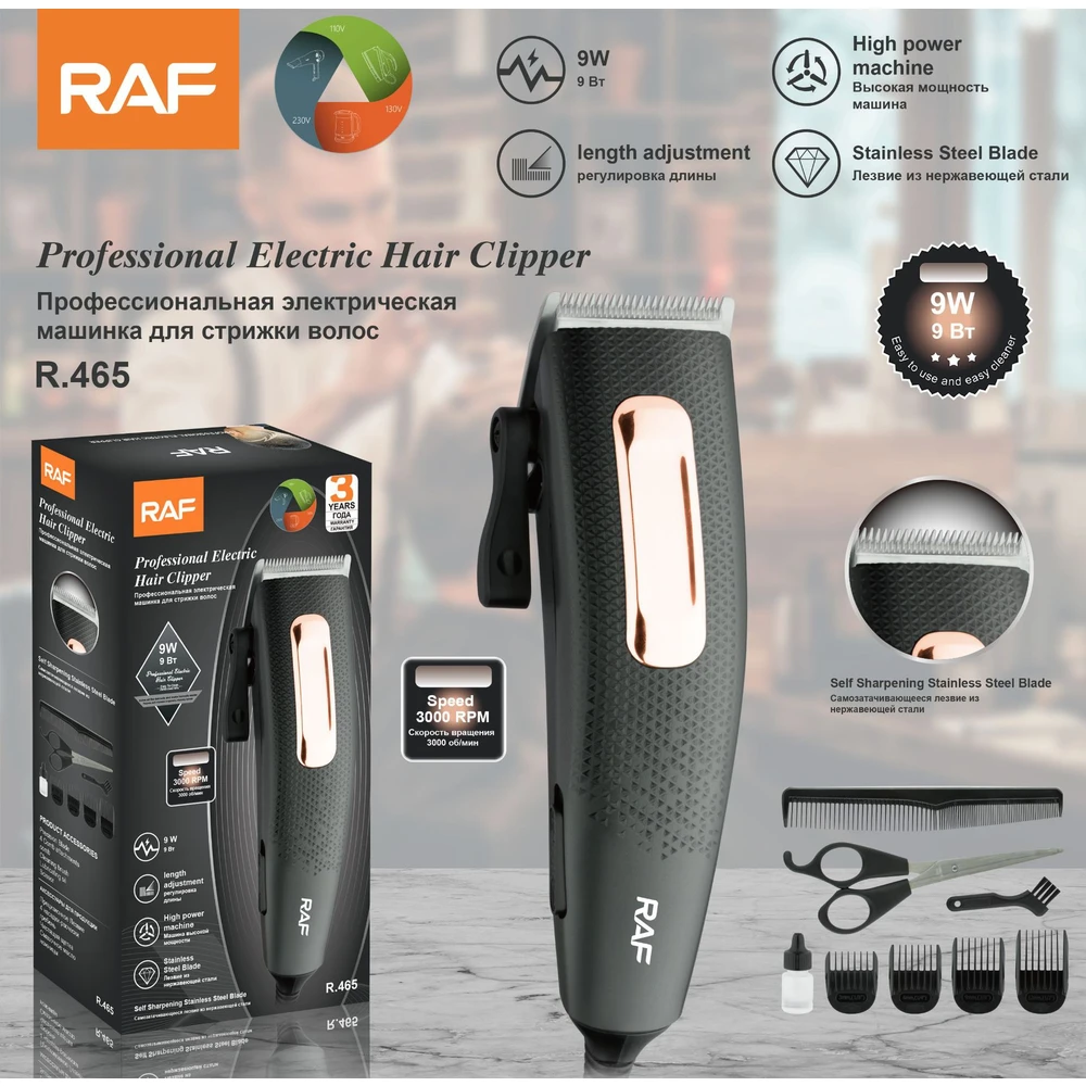 Машинка для стрижки волос RAF R.465 — это высококачественный инструмент для профессионального ухода за волосами. Идеально подходит для создания разнообразных стрижек в салоне или дома. Благодаря мощному мотору 9 Вт, скорости 3000 об/мин и лезвиям из нержавеющей стали, она обеспечивает долговечность и комфорт. Ширина ножа 45 мм делает её идеальной для точной работы и обработки средних участков, а стильный черный цвет добавляет элегантности. Простота в уходе и надежное питание от сети делают её незаменимой для парикмахеров и энтузиастов стиля.
