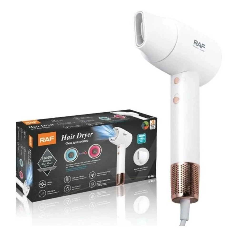 Фен RAF R.423 — стильный и мощный стандартный фен с 1600 Вт мощности, ионизацией для защиты волос и 3 режимами воздушного потока. Легкий вес 0.38 кг и холодный обдув делают его идеальным для быстрого и комфортного укладывания волос дома!