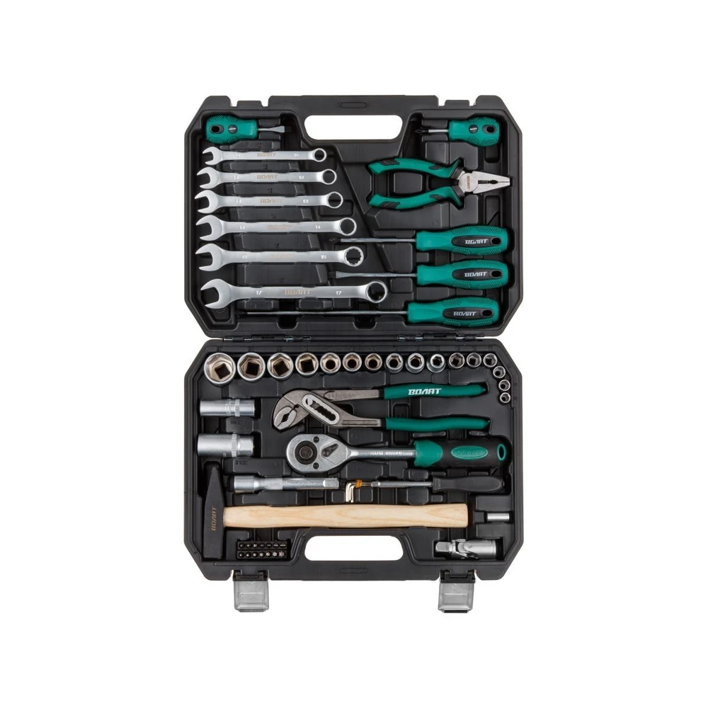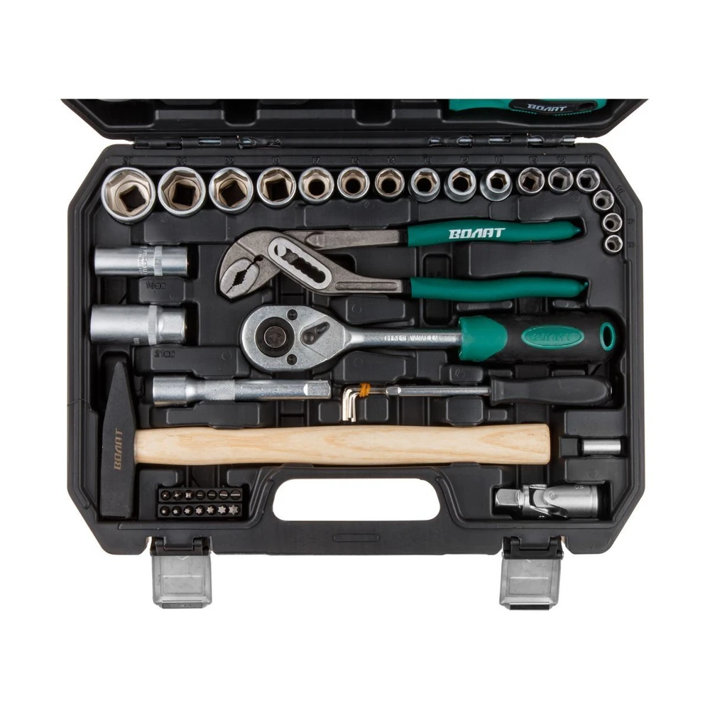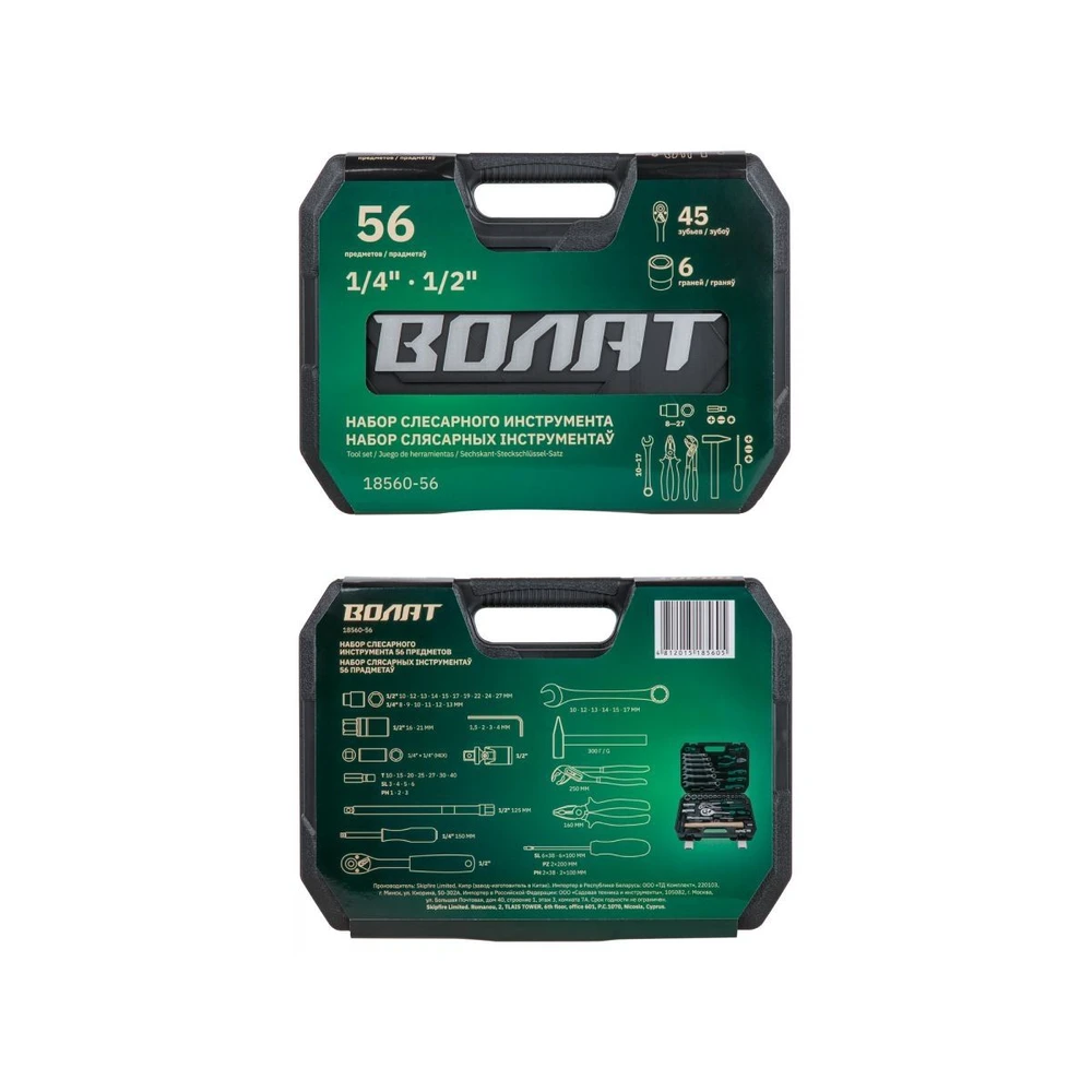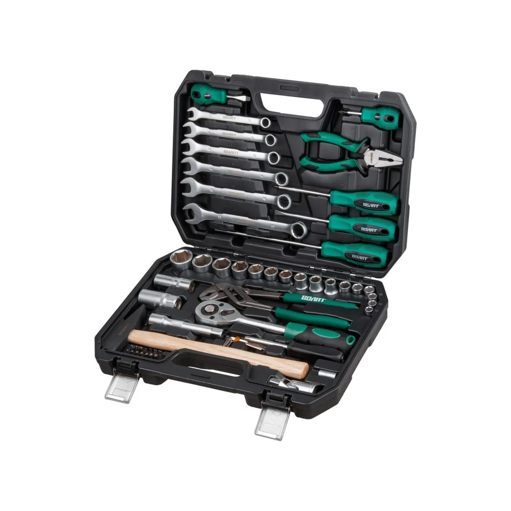 Полный набор слесарного инструмента ВОЛАТ — незаменимый помощник для автолюбителей и мастеров! Этот многофункциональный комплект из 56 предметов идеально подходит для ремонта и обслуживания автомобилей, а также для выполнения разнообразных слесарных работ. Рабочие части изготовлены из высококачественной инструментальной стали с сатинированной финишной обработкой, обеспечивая долговечность и комфорт в использовании. Шестигранный профиль головок гарантирует надежный захват, а трещоточный механизм с 45 зубьями позволяет работать эффективно даже в тесных пространствах. Всё аккуратно организовано в прочном кейсе из противоударного пластика с металлическими замками, что облегчает хранение и перевозку.