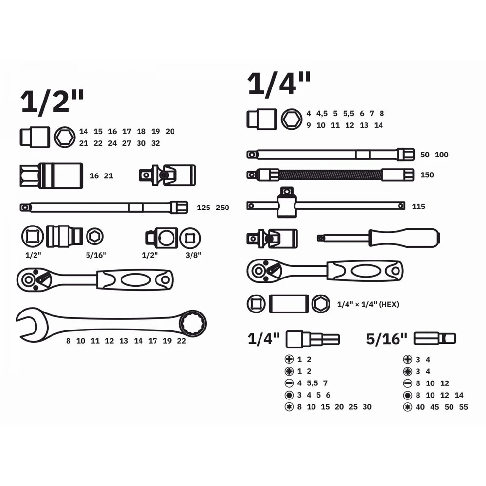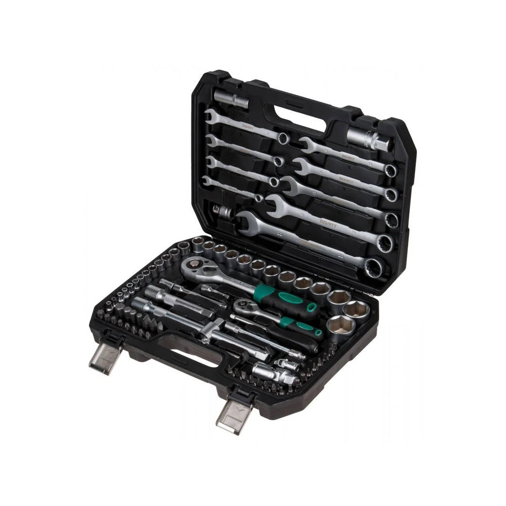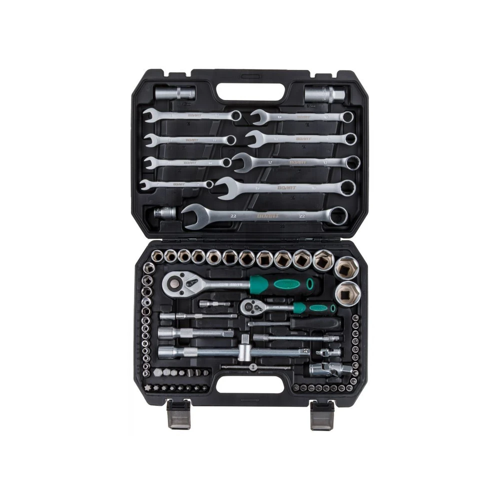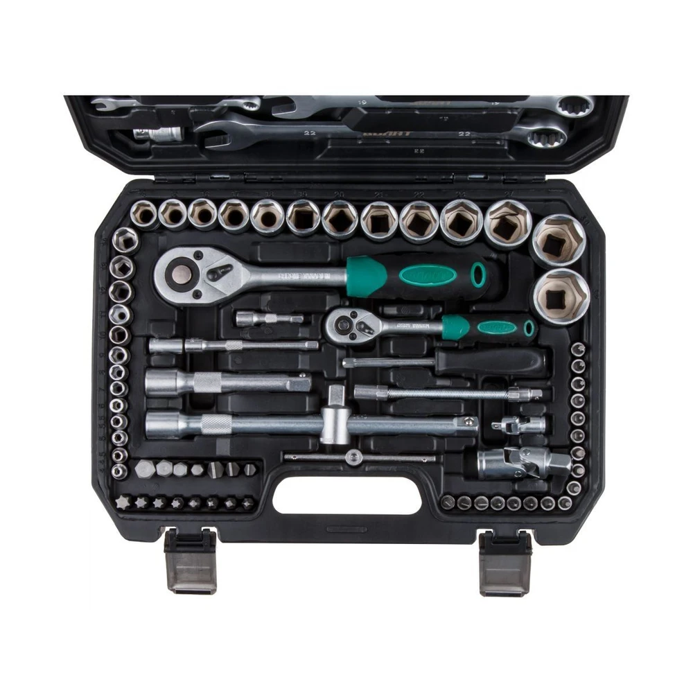 - Полная комплектация: 82 предмета для всех типов автомобильных работ — от замены свечей до сложного монтажа.