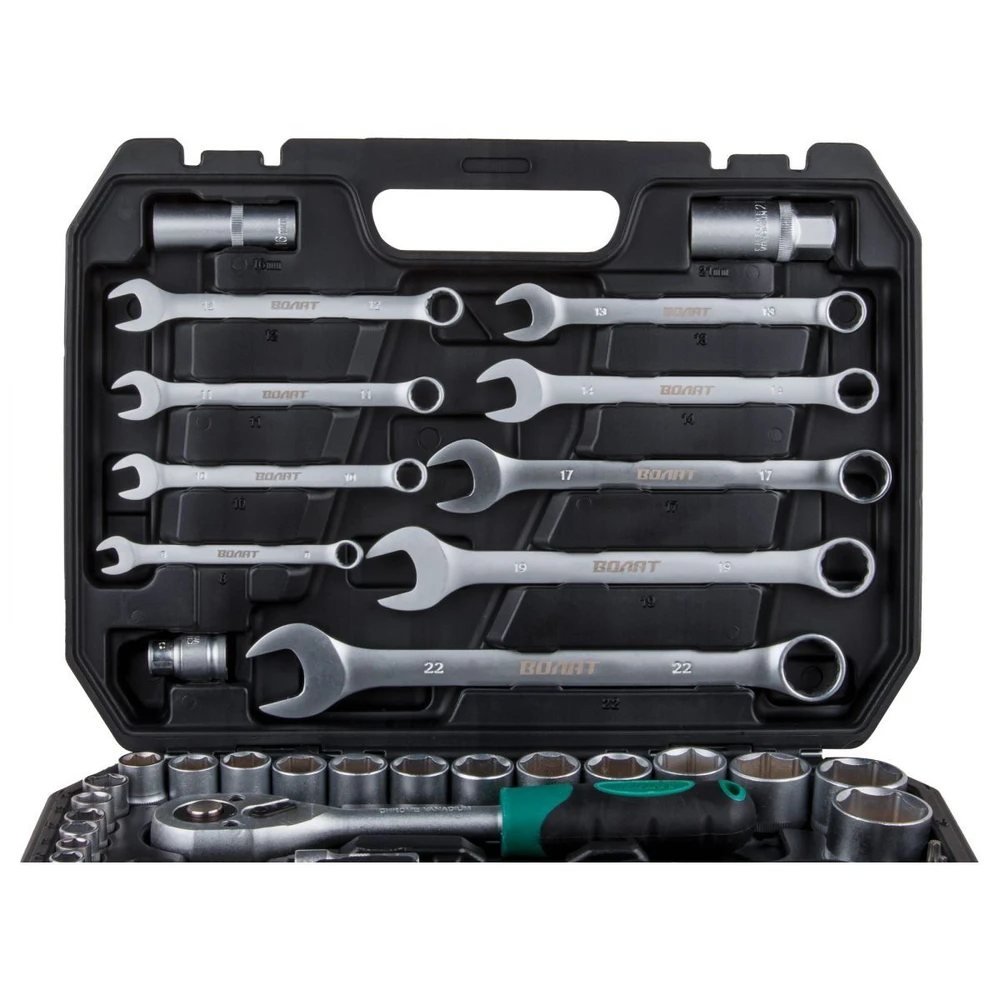 Откройте мир профессионального ремонта с набором головок и ключей ВОЛАТ — идеальным решением для автолюбителей и механиков! Этот многофункциональный комплект из 82 предметов создан специально для ремонта и обслуживания автомобилей, обеспечивая точность и эффективность в каждой задаче. Рабочие части изготовлены из прочной инструментальной стали с сатинированной финишной обработкой, что гарантирует долговечность и комфорт при работе. Шестигранный профиль головок обеспечивает надежный захват, а трещоточный механизм с 45 зубьями позволяет легко маневрировать в ограниченном пространстве. Всё удобно хранится в прочном кейсе из противоударного пластика с металлическими замками, готовом к транспортировке в гараж или на выезд.